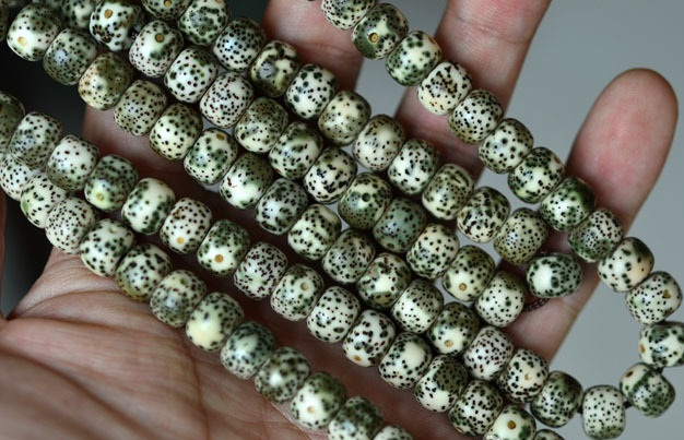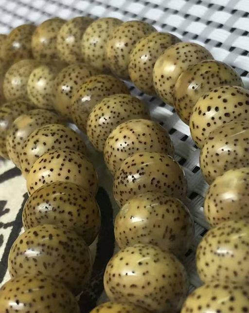 带有阴皮的星月菩提被称为“阴皮籽”。这样的珠子其实并不美观,花花绿绿,斑斑点点,并不讨人喜欢。